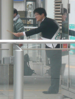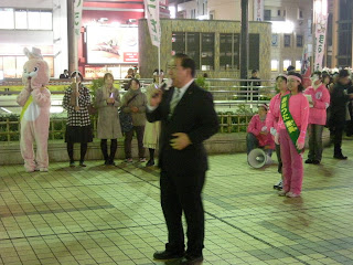 | 統一協会青年信者が60人以上動員された松戸市議選最終日 松戸駅デッキで挨拶する鈴木雄三選対本部長(2010.11.20) |