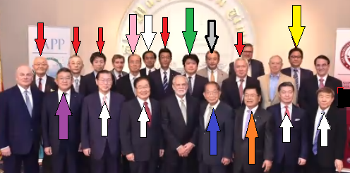 白矢印が教団関係者、国会議員団のうち黄色矢印が現役国会議員、青矢印が現役国会議員以外の人物、赤矢印が未判明の人物。赤矢印3人のうちの2人が現役国会議員と思われる。